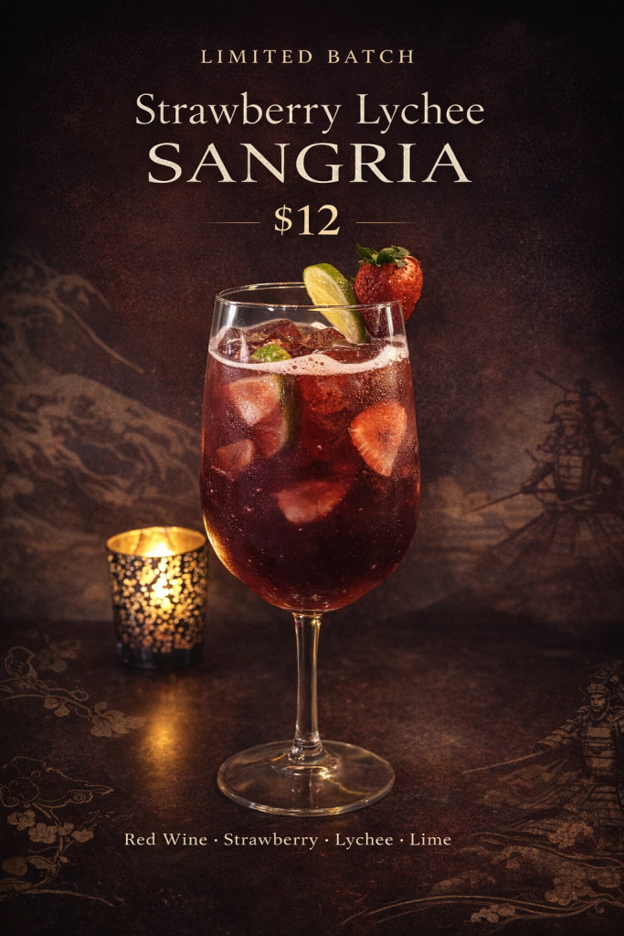 | 🍓 Strawberry Lychee Sangria A vibrant sangria inspired by the harmony of sweet fruit and fresh citrus. Juicy strawberry and fragrant lychee mingle with red wine and a splash of lime, finished with a light sparkle for a refreshing lift. Bright, playful, and perfectly balanced — a sangria made for sharing. | 12.00 |